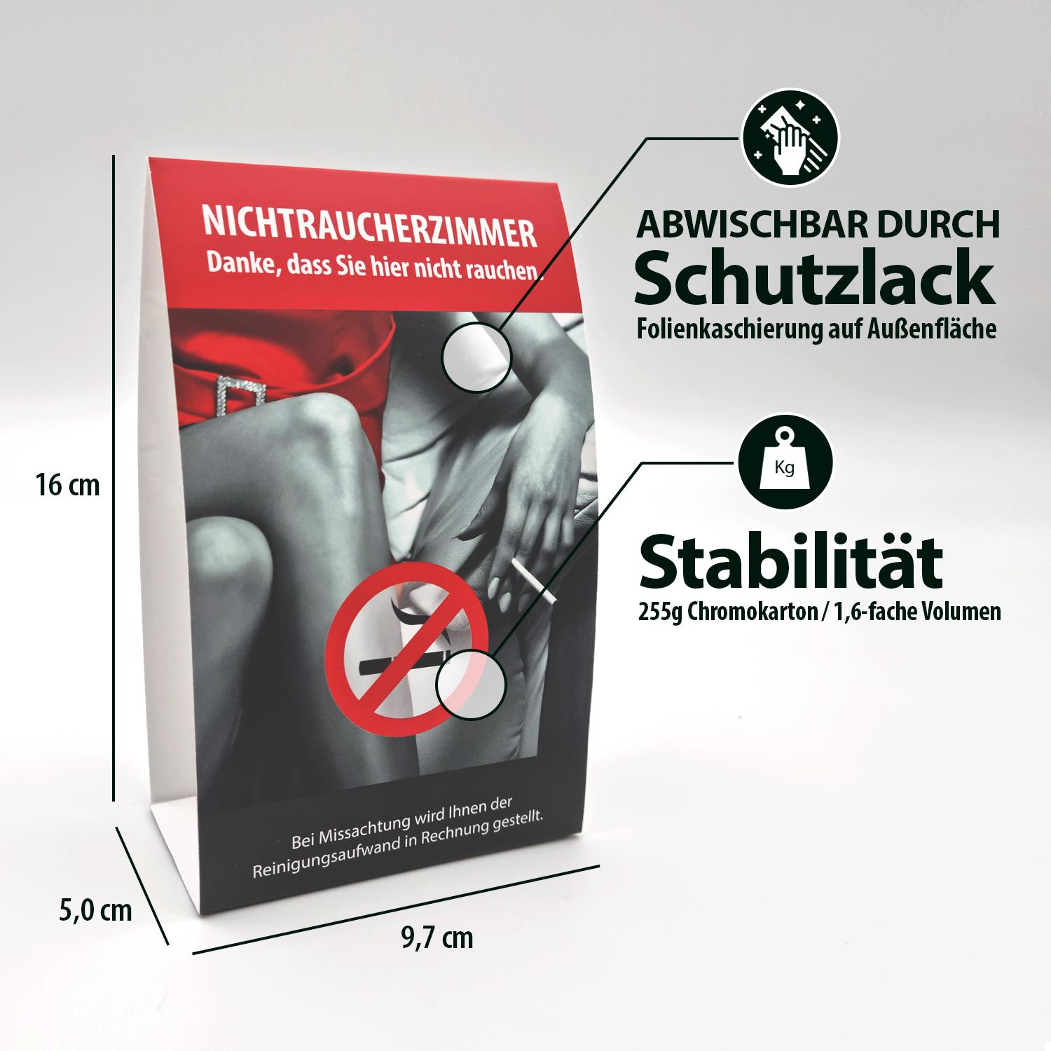Weisen Sie Ihre Gäste darauf hin, dass in Ihren Zimmern das Rauchen verboten ist. Durch den beidseitigen Aufdruck in deutscher sowie in englischer Sprache ist dieses Tischschild auch ideal für internationale Gäste geeignet. Der Aufdruck "Nichtraucherzimmer" (engl. Non smoking room) weißt Ihre Gäste freundlich darauf hin, dass Rauchen unerwünscht ist. Die Folienkaschierung sorgt für eine hygienische und abwischbare Oberfläche, so dass Sie die Schilder auch langfristig verwenden können. Der Aufsteller wird einfach aufgefaltet, zusammengesteckt und an einem gut sichtbaren Platz aufgestellt. Bei Lieferung sind die Schilder zusammengefaltet, womit sie sich platzsparend verstauen und lagern lassen.