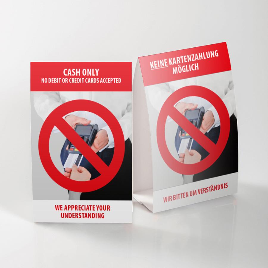 Sie haben ein Ladenlokal, ein Restaurant oder eine Bar und möchten Ihre Kunden darauf hinweisen, dass eine Kredit- oder Kartenzahlung bei Ihnen nicht möglich ist, dann bestellen Sie bei uns den Tischaufsteller: Keine Kartenzahlung möglich